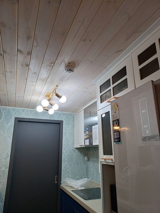 기존에 시공되어있던 반투명 도장된 스프러스 자재와 이질감이 없도록 색상과 규격을 맞춰서 공사를 했습니다.