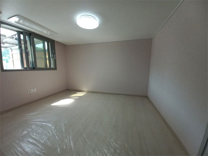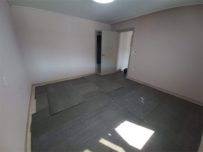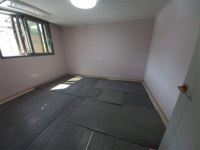 공사에 앞서 방바닥을 보호하기 위한 비닐을 깝니다.
