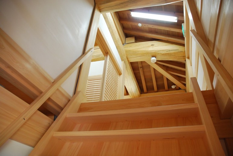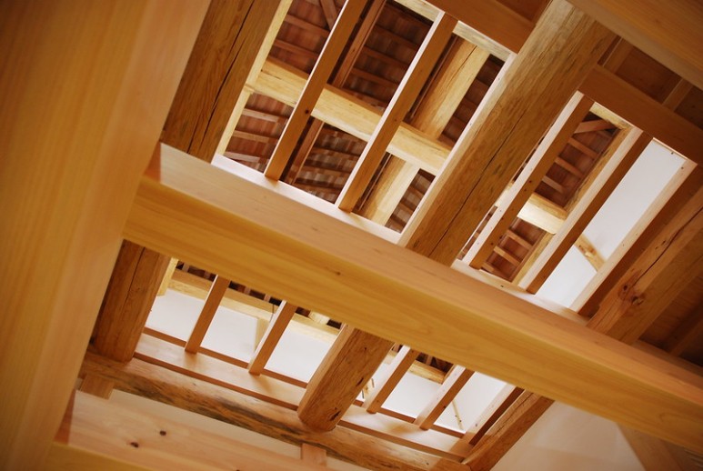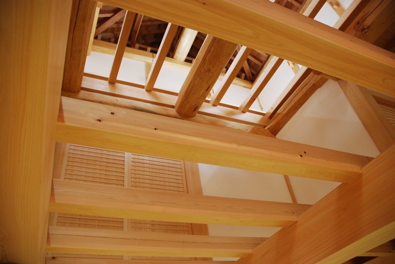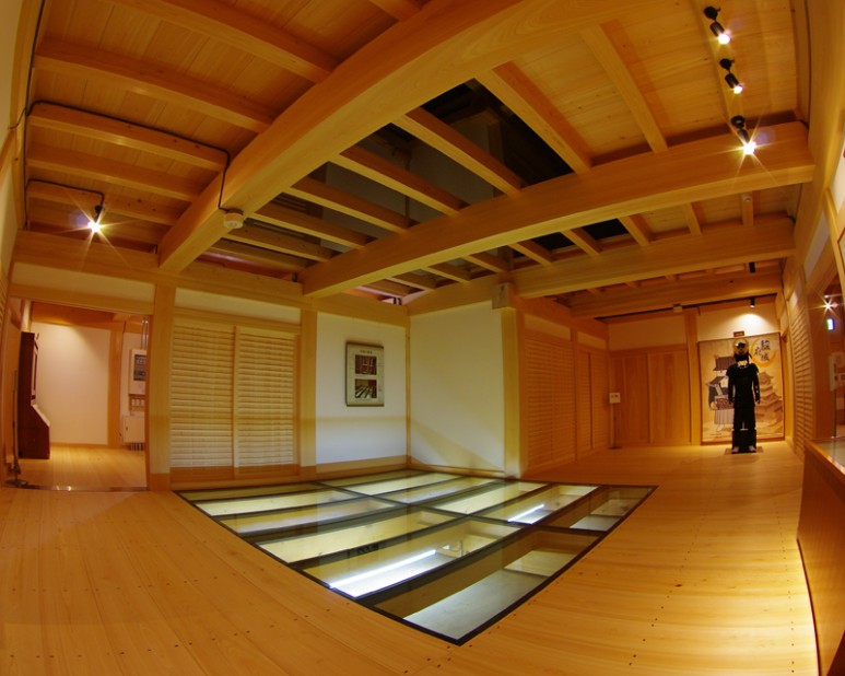 시즈오카현내 각지에서 벌채된 히노끼, 스기, 마쯔(소나무) 원목 대경재로 이루어진 내부 구조.