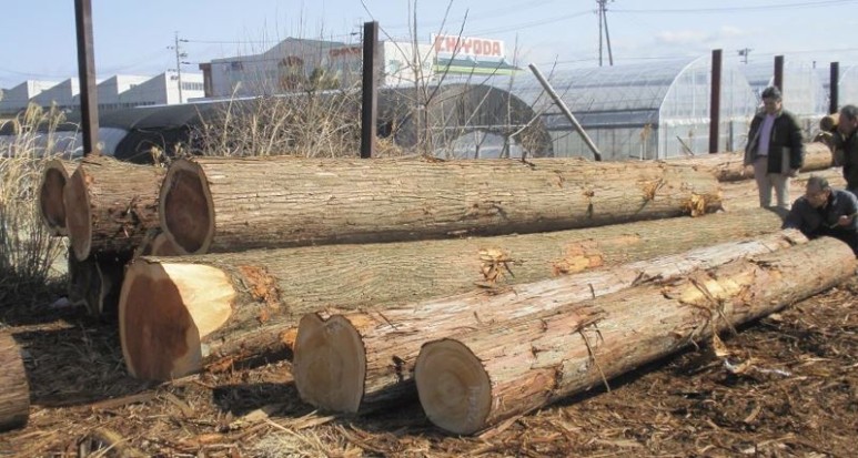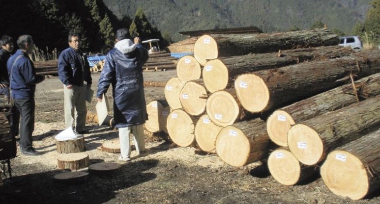 벌목되어 제재를 기다리는 삼나무(왼쪽)와 편백나무(오른쪽 2개) 원목 대경재