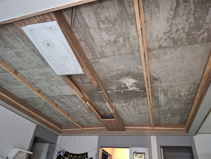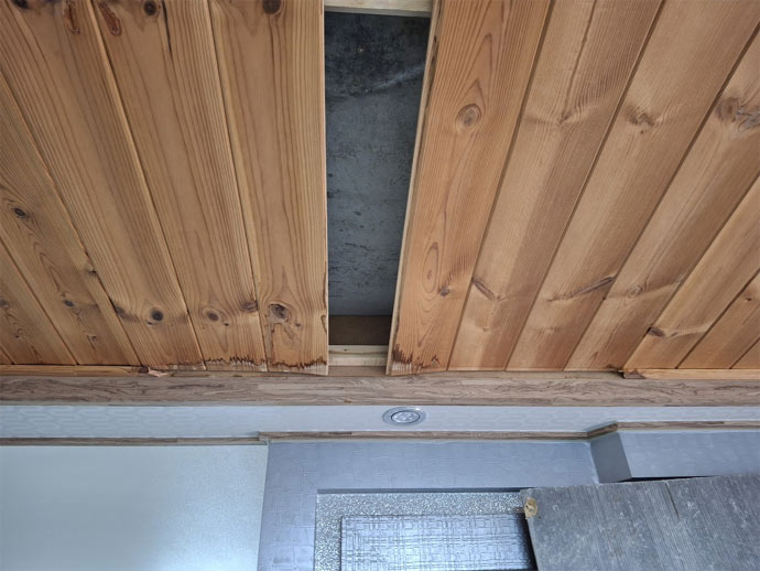 천정에서 누수가 발생하여 미송천정재가 침수되어 변색이 되었고 배선인지 전등도 영향을 받아 중앙등 둘중 하나가 점등되지 않습니다.