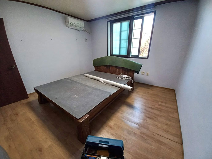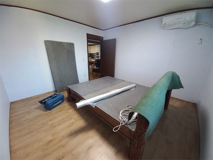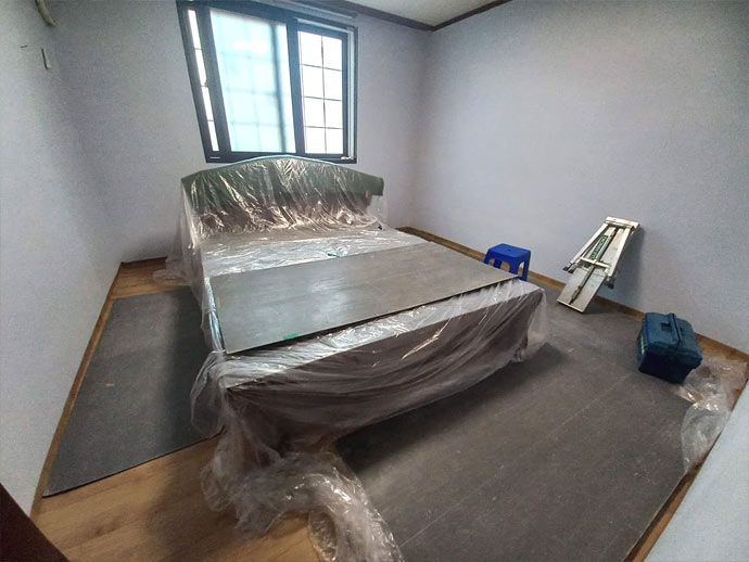 방 안에 자리한 킹사이즈 돌침대는 빼낼 수가 없어서 (전문업자를 불러야함) 흠집이 나자 않도록 보양재와 비닐로 덮어두고 공사를 진행합니다.